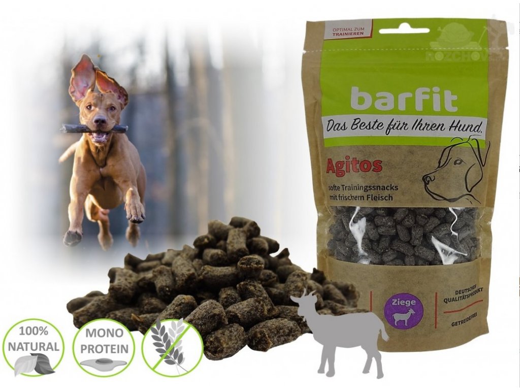 S tréninkovým pamlskem Agitos odměníte svého psa cíleně a zdravě. S malými kousky nepřekrmujete během tréninku a přesto uděláte svému psovi radost. Nový barfit AGITOS koza v praktickém 350g sáčku. Je malý, měkký, bez obilovin, bez brambor, pouze s jedním zdrojem živočišných bílkovin a vyrobený převážně z čerstvých potravinářských surovin.