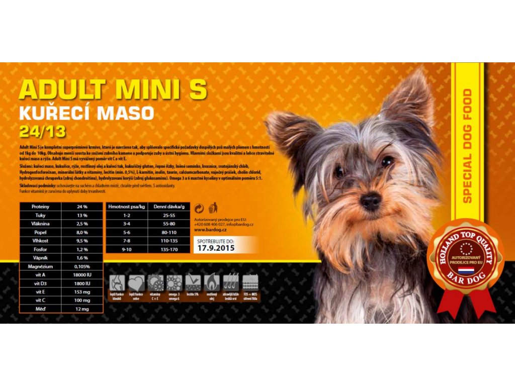Adult Mini S je kompletní super prémiové krmivo, které je navrženo tak, aby splňovalo specifické požadavky dospělých psů malých plemen s hmotností od 1kg do 10kg. Obsahuje menší sousta ke snížení zubního kamene a podporuje zdravé dásně a zuby. Hlavními složkami jsou kvalitní a lehce stravitelné kuřecí maso a rýže. Adult Mini S má vyvážený poměr vit C a vit E. Naše receptura neobsahuje žádnou pšenici, sóju, krev nebo gen-manipulované přísady.