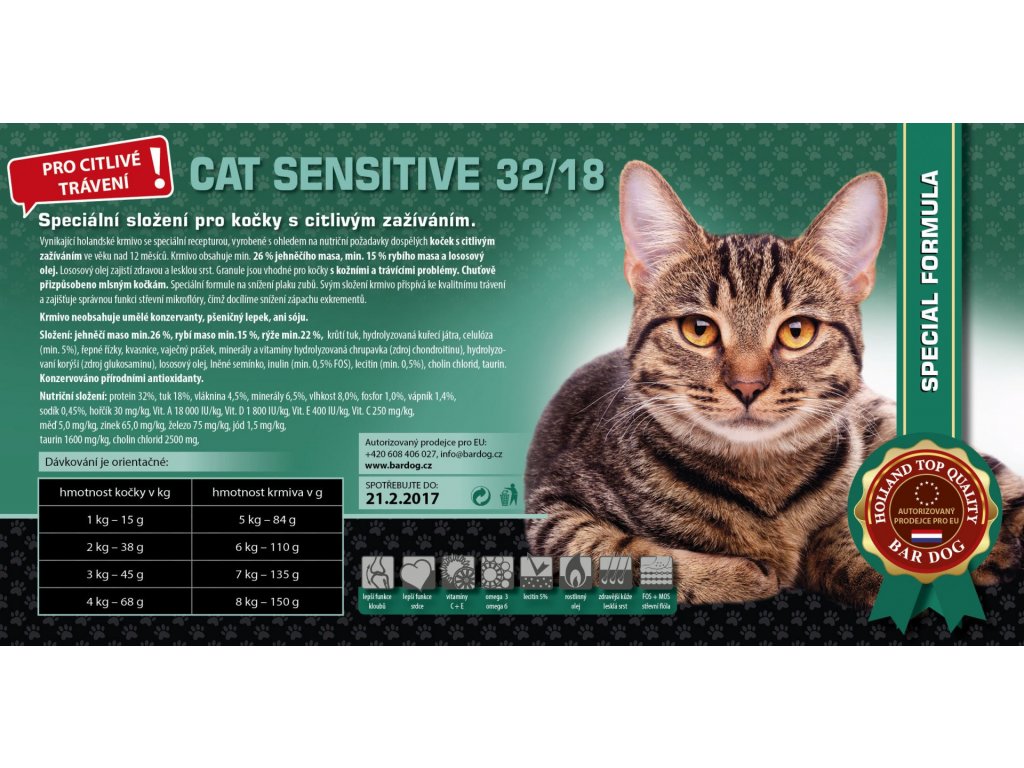 Vynikající holandské krmivo se speciální recepturou, vyrobené s ohledem na nutriční požadavky dospělých koček s citlivým zažíváním ve věku nad 12 měsíců. Krmivo obsahuje min. 26 % jehněčího masa, min. 15 % rybího masa a lososový olej. Lososový olej zajistí zdravou a lesklou srst. Granule jsou vhodné pro kočky s kožními a trávícími problémy. Chuťově přizpůsobeno mlsným kočkám. Speciální formule na snížení plaku zubů. Svým složení krmivo přispívá ke kvalitnímu trávení a zajišťuje správnou funkci střevní mikroflóry, čímž docílíme snížení zápachu exkrementů. Krmivo neobsahuje umělé konzervanty, pšeničný lepek, ani sóju.