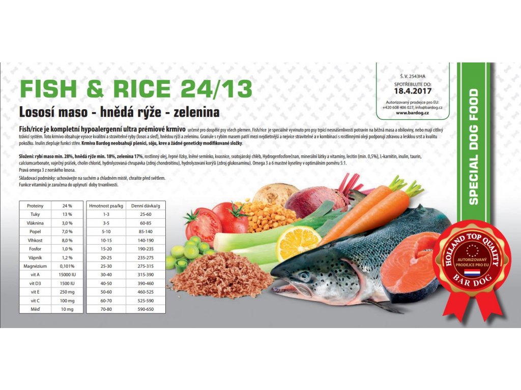 Fish/rice je kompletní hypoalergenní ultra prémiové krmivo určené pro dospělé psy všech plemen. Fish/rice je speciálně vyvinuto pro psy trpící potravinovou alergií na běžné druhy masa a obilovin, nebo mající citlivý trávicí systém. Toto krmivo obsahuje vysoce kvalitní a stravitelné ryby (losos a sleď), hnědou rýži a zeleninu. Granule s rybím masem patří mezi nejdietnější a nejlépe stravitelné a v kombinaci s kvalitními rostlinnými oleji podporují zdravou a lesklou srst a kvalitu pokožky. Inulin zlepšuje funkci střev. Krmiva Bardog neobsahují pšenici, sóju, krev a žádné geneticky modifikované složky.