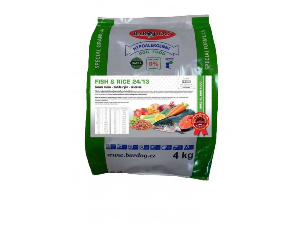 Fish/rice je kompletní hypoalergenní ultra prémiové krmivo určené pro dospělé psy všech plemen. Fish/rice je speciálně vyvinuto pro psy trpící potravinovou alergií na běžné druhy masa a obilovin, nebo mající citlivý trávicí systém. Toto krmivo obsahuje vysoce kvalitní a stravitelné ryby (losos a sleď), hnědou rýži a zeleninu. Granule s rybím masem patří mezi nejdietnější a nejlépe stravitelné a v kombinaci s kvalitními rostlinnými oleji podporují zdravou a lesklou srst a kvalitu pokožky. Inulin zlepšuje funkci střev. Krmiva Bardog neobsahují pšenici, sóju, krev a žádné geneticky modifikované složky.