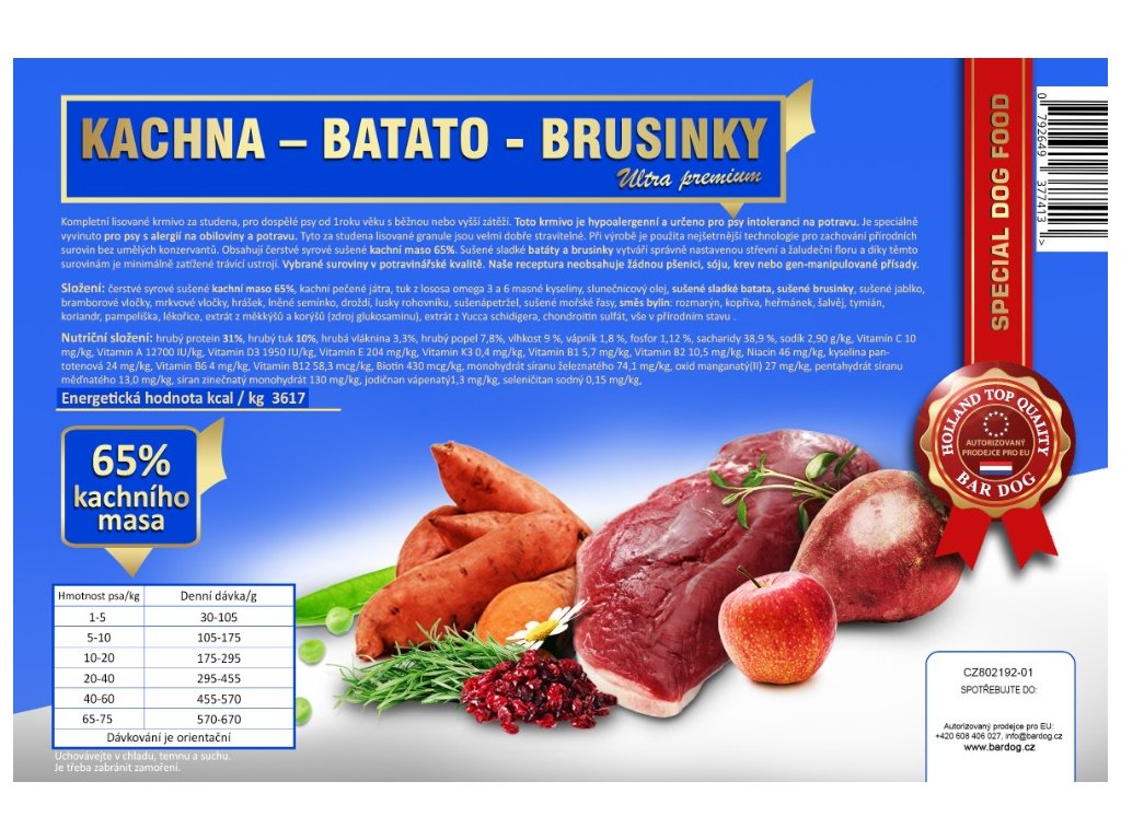 Granule obsahují čerstvé kachní maso 65%. Sladké batáty a brusinky vytváří správně nastavenou střevní a žaludeční mikrofloru. I díky těmto surovinám je minimálně zatížené trávící ustrojí. Vybrané suroviny jsou v potravinářské kvalitě. Naše receptura neobsahuje žádnou pšenici, sóju, krev nebo gen-manipulované přísady.