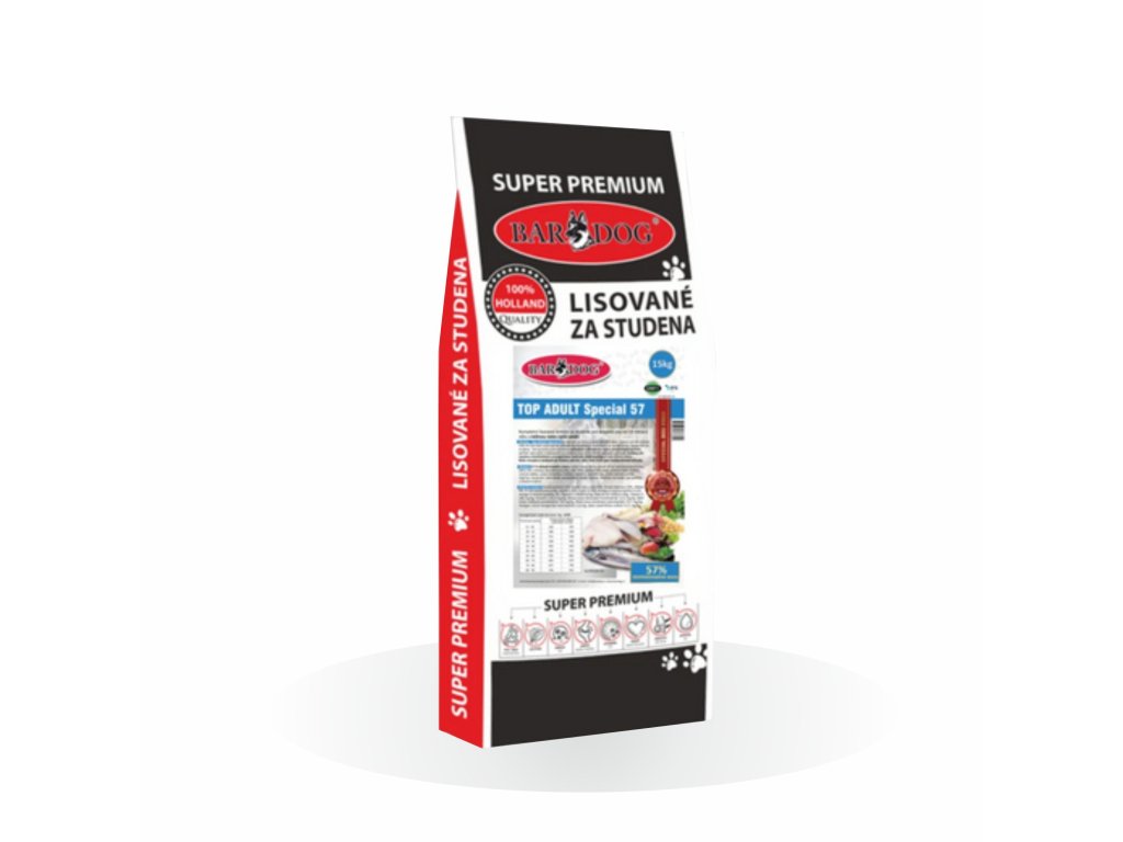 Kompletní lisované krmivo za studena pro dospělé psy je určeno pro psy s běžnou nebo vyšší zátěží. Krmivo Bardog Top Adult Special 57 je bohaté na živiny a další důležité látky. Složení tohoto přírodního krmiva bylo vyvinuto na základě dlouhodobých zkušeností ve výrobě krmiv lisovaných za studena.