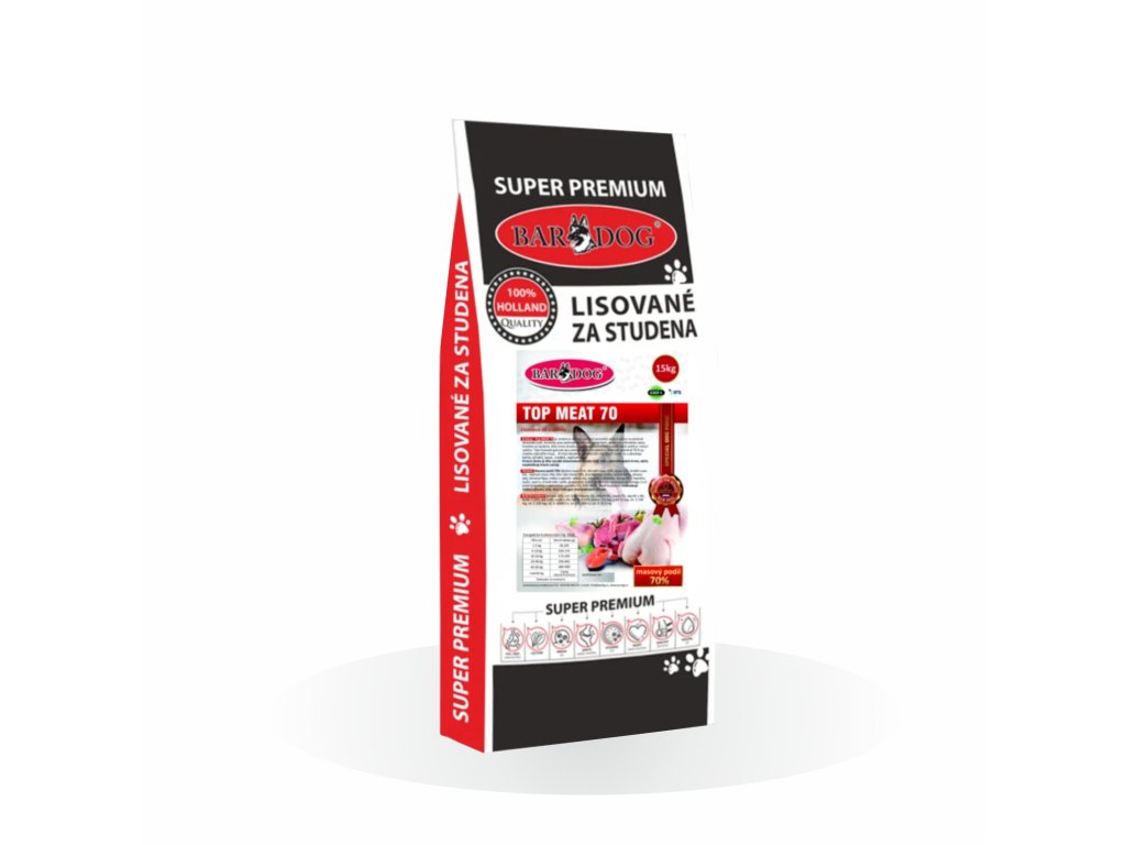 Krmivo - TOP MEAT 70 je vyrobeno dle nejnovějších poznatků vědy týkající se výživy psů. Suroviny jsou zachovány bez technologických úprav a v přírodním stavu jsou lisovány za studena. Díky tomu je dosaženo vysoké stravitelnosti a nedochází k zbytečnému zatěžování trávicího systému. Takto slisované granule jsou navíc vzhledem k 70 % obsahu sušeného syrového masa neodolatelně chutné. Jedná se o holistické krmivo, které obsahuje sušené kuřecí, jehněčí, lososí, králičí a vepřové maso. Navíc je tato receptura bez obilovin - grain free, takže vhodná i pro některé psí alergiky.