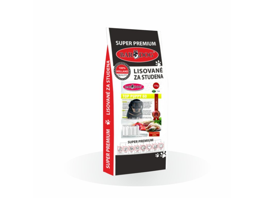 POZOR ZVĚTŠENÍ VELIKOSTI VÝLISKŮ - srovnání nové a původní velikosti je v přiložených obrázcích. Krmivo - TOP PUPPY 60 je vyrobeno dle nejnovějších poznatků vědy týkající se výživy psů. Suroviny jsou zachovány bez technologických úprav a v přírodním stavu jsou lisovány zastudena. Díky tomu je dosaženo vysoké stravitelnosti a nedochází k zbytečnému zatěžování trávicího systému. Takto slisované granule jsou navíc vzhledem k 60 % obsahu sušeného syrového masa neodolatelně chutné. Jedná se o holistické krmivo, které obsahuje sušené kuřecí, hovězí, lososí, králičí a vepřové maso. Navíc je obohaceno o sušenou syrovátku a mléko, které vyhovují potřebám štěňátek a usnadňují jejich přechod na pevnou stravu. TOP PUPPY 60 obsahuje výhradně vysoce kvalitní přísady v optimálním poměru pro růst štěněte. Receptura je kompletně bez obilovin - grain free, takže vhodná i pro některé psí alergiky.