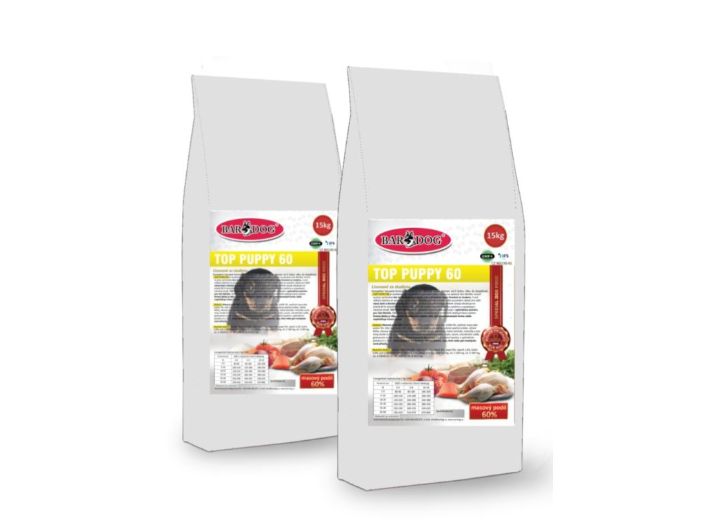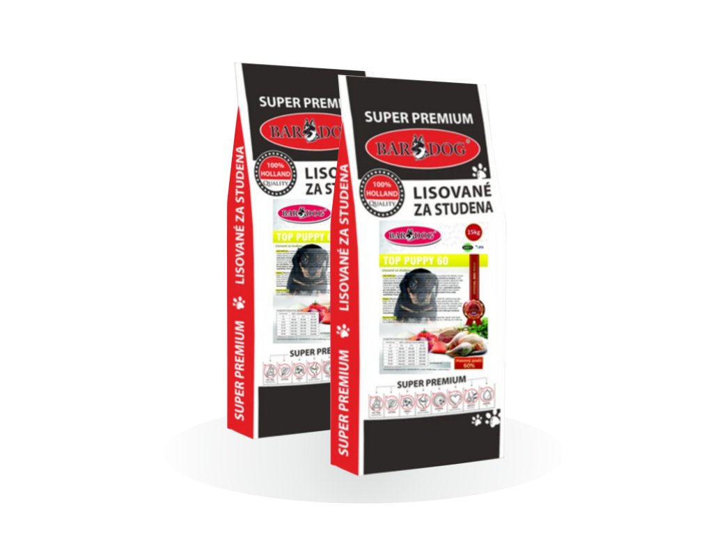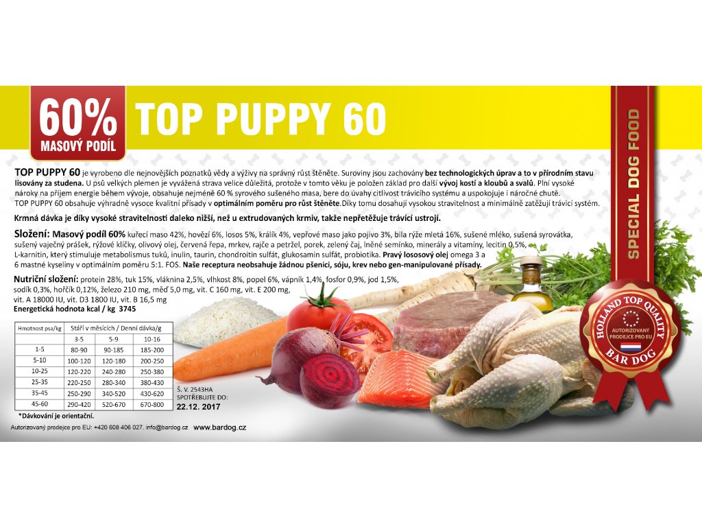 POZOR ZVĚTŠENÍ VELIKOSTI VÝLISKŮ - srovnání nové a původní velikosti je v přiložených obrázcích. Krmivo - TOP PUPPY 60 je vyrobeno dle nejnovějších poznatků vědy týkající se výživy psů. Suroviny jsou zachovány bez technologických úprav a v přírodním stavu jsou lisovány zastudena. Díky tomu je dosaženo vysoké stravitelnosti a nedochází k zbytečnému zatěžování trávicího systému. Takto slisované granule jsou navíc vzhledem k 60 % obsahu sušeného syrového masa neodolatelně chutné. Jedná se o holistické krmivo, které obsahuje sušené kuřecí, hovězí, lososí, králičí a vepřové maso. Navíc je obohaceno o sušenou syrovátku a mléko, které vyhovují potřebám štěňátek a usnadňují jejich přechod na pevnou stravu. TOP PUPPY 60 obsahuje výhradně vysoce kvalitní přísady v optimálním poměru pro růst štěněte. Receptura je kompletně bez obilovin - grain free, takže vhodná i pro některé psí alergiky.