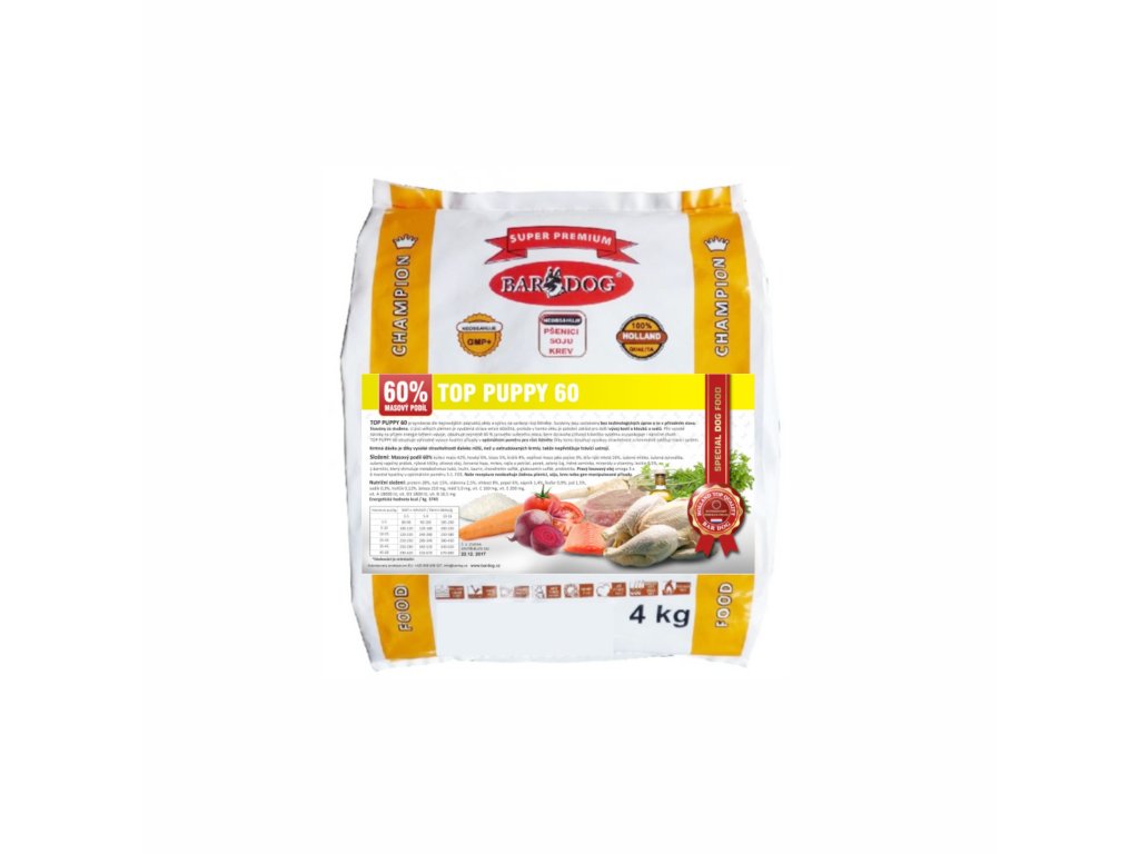 POZOR ZVĚTŠENÍ VELIKOSTI VÝLISKŮ - srovnání nové a původní velikosti je v přiložených obrázcích. Krmivo - TOP PUPPY 60 je vyrobeno dle nejnovějších poznatků vědy týkající se výživy psů. Suroviny jsou zachovány bez technologických úprav a v přírodním stavu jsou lisovány zastudena. Díky tomu je dosaženo vysoké stravitelnosti a nedochází k zbytečnému zatěžování trávicího systému. Takto slisované granule jsou navíc vzhledem k 60 % obsahu sušeného syrového masa neodolatelně chutné. Jedná se o holistické krmivo, které obsahuje sušené kuřecí, hovězí, lososí, králičí a vepřové maso. Navíc je obohaceno o sušenou syrovátku a mléko, které vyhovují potřebám štěňátek a usnadňují jejich přechod na pevnou stravu. TOP PUPPY 60 obsahuje výhradně vysoce kvalitní přísady v optimálním poměru pro růst štěněte. Receptura je kompletně bez obilovin - grain free, takže vhodná i pro některé psí alergiky.