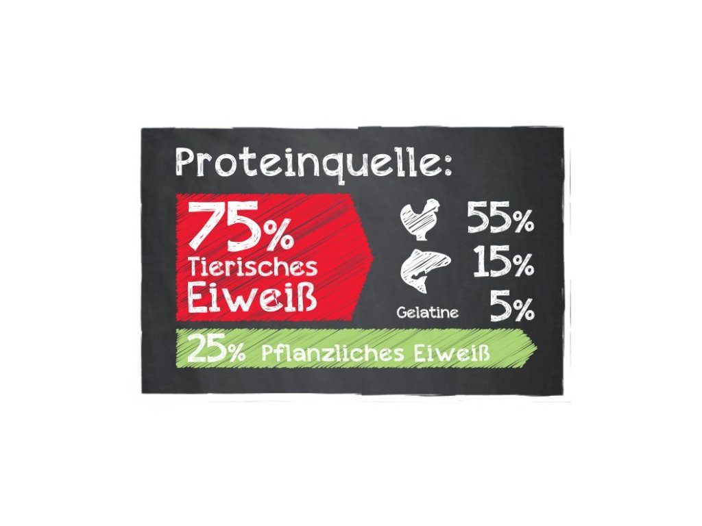 75 % živočišné bílkoviny (55% z drůbeže, 15 % z ryb, 5% z želatiny)