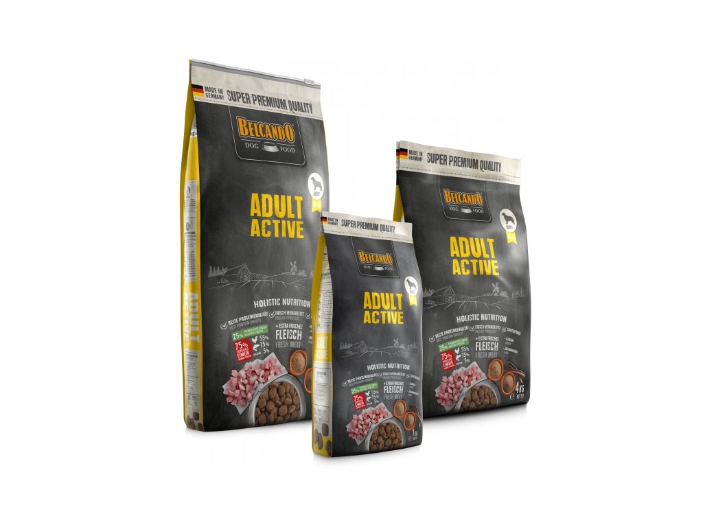 Belcando adult active je superprémiové holistické krmivo určené pro dospělé psy při zvýšené zátěži. Je vyrobeno dle německé receptury z kvalitních surovin. Všechny bílkoviny v Belcandu jsou ze zvířat, které byly určeny i pro lidskou spotřebu. Krmiva obsahují maximální podíl masa. A jsou zde použity jen vysoce kvalitní masové moučky, jejichž kvalitu potvrzuje 10% vyšší obsah proteinů oproti standardu a minimum obsahu popela, protože podíl kostí je 50 % pod průměrem. Tím je dosaženo výborné snášenlivosti a stravitelnosti.Je vyrobeno dle německé receptury z kvalitních surovin. Všechny bílkoviny v Belcandu jsou ze zvířat, které byly určeny i pro lidskou spotřebu. Krmiva obsahují maximální podíl masa. Krmivo neobsahuje žádné chemické konzervanty, barviva, zchutňovadla, soju, rostlinné proteinové koncentráty, "krmné maso", "krmné obiloviny", geneticky modifikované suroviny, syntetické antioxidanty - tuky v krmivu jsou chráněny vitamínem E a rozmarýnem. Všechny suroviny použité pro výrobu krmiv Belcando jsou testovány ve státem akreditovaných laboratořích. Státní zdravotní testy SRN garantují nejvyšší možnou zdravotní bezpečnost.