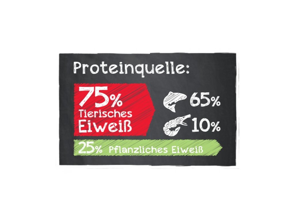 75 % živočišné bílkoviny (mořské ryby 65 %, mořský zooplankton/krill 10 %)