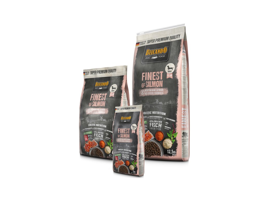 čerstvý losos (30%), amarant (16,5%), bramborový škrob; hrachová mouka, lososová moučka (8,5 ); sleďová moučka (7,5), mořský zooplankton krill (4,5%), lososový olej (2,5%); rostlinný olej (palmový, kokosový);výlisky z hroznových jader; sušené pivovarské kvasnice (2,5%); sušené lusky svatojánského chleba, sušený losos, semena chia, sušené odcukřené cukrovarské řízky, hydrogen fosforečnan vápenatý; chlorid sodný; chlorid draselný; sušené byliny (0,2 % – kopřivové listy, kořen hořce, zeměžluč, heřmánek, fenykl, kmín, jmelí, řebříček, ostružiny); juka