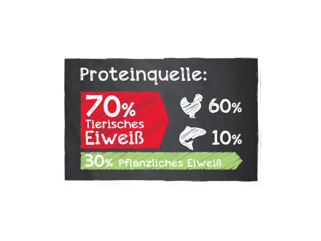 70 % živočišné bílkoviny (60 % z drůbeže, 10 % z ryb)