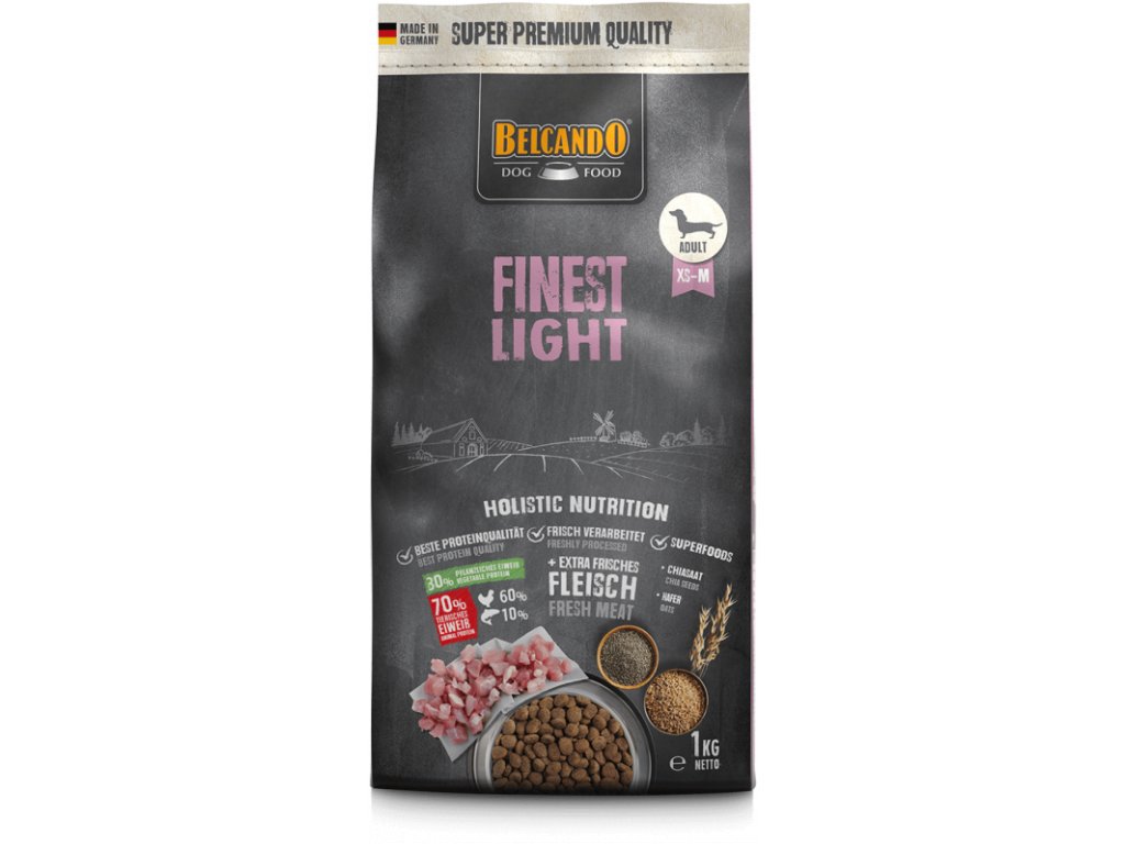 Pečlivě vybírané suroviny, lehce stravitelné drůbeží, chutné kachní maso, sytý oves a trávení podporující šalvějová semínka dělají z BELCANDO ® FINEST LIGHT zdravé krmivo pro tuto skupinu psů. Zdrojem proteinů je zde vysoce kvalitní kachní,drůbeží a sleďová moučka. Tři obsažené moučky zajišťují vysokou chutnost krmiva a i vybíraví jedinci jej tak s radostí přijímají. 70 % proteinů obsažených v krmivu je živočišného původu.