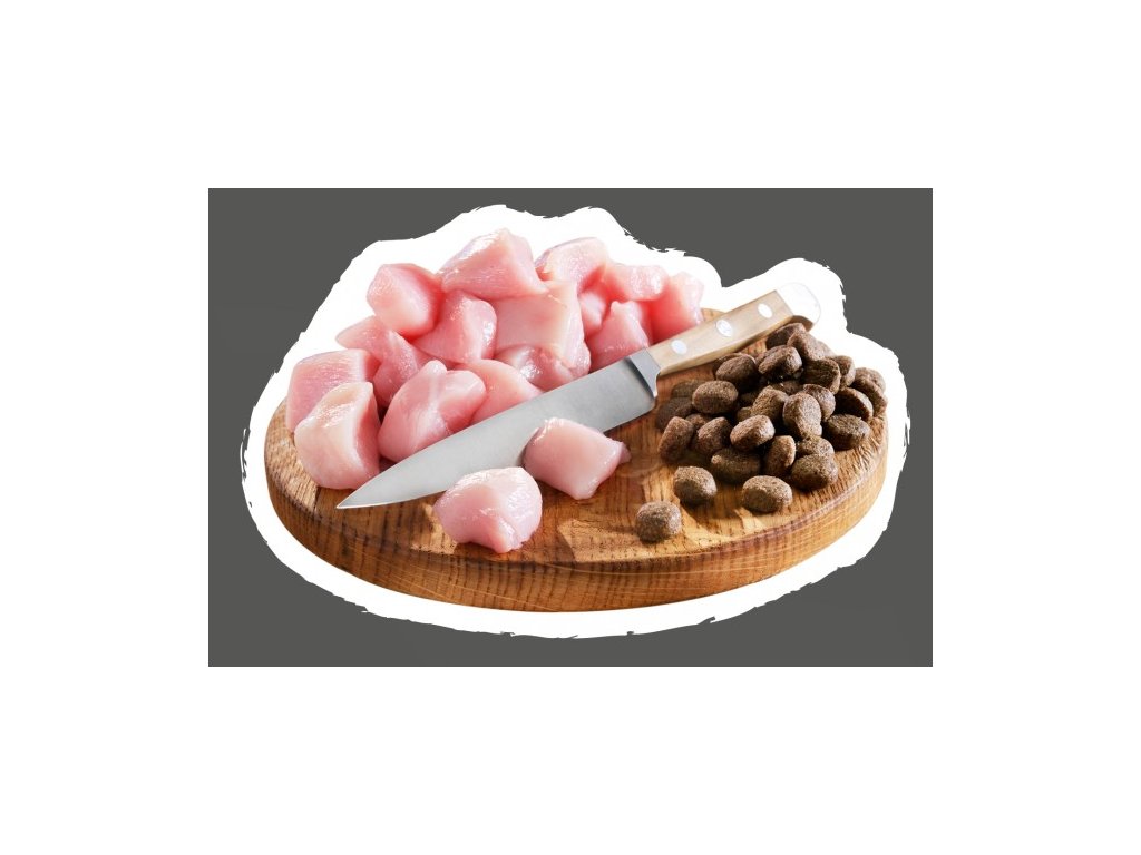 70 % živočišné bílkoviny (60 % z drůbeže, 10 % z ryb)