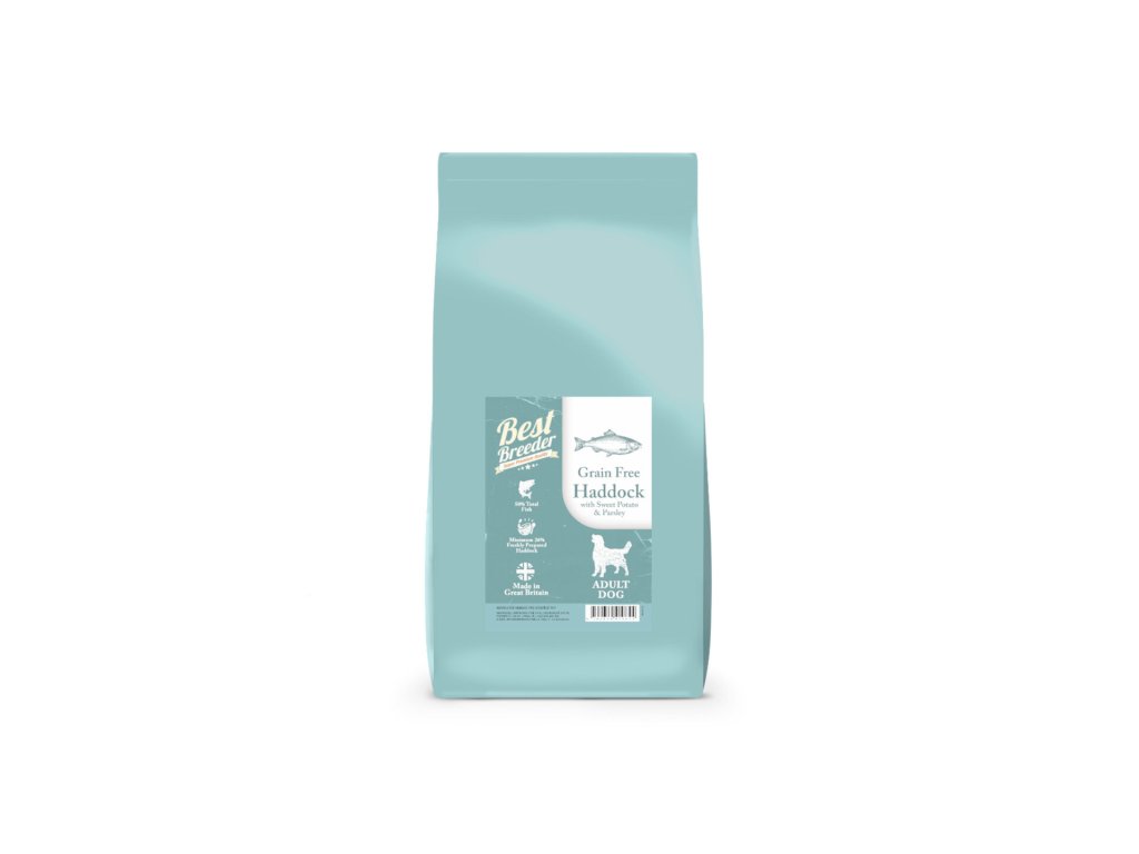 Ryby 50 % (včetně čerstvě připravované tresky 26 %, sušeného lososa 17,5 %, pstružího oleje 4,5 %, lososového vývaru 2 %), sladké brambory 24 %, sladký hrášek 7 %, brambory, řepná dužina, olivový olej, lněné semínko, slunečnicový olej, minerály, vitaminy, petržel 0,3 %, zeleninový vývar, FOS 96 mg/kg, MOS 24 mg/kg