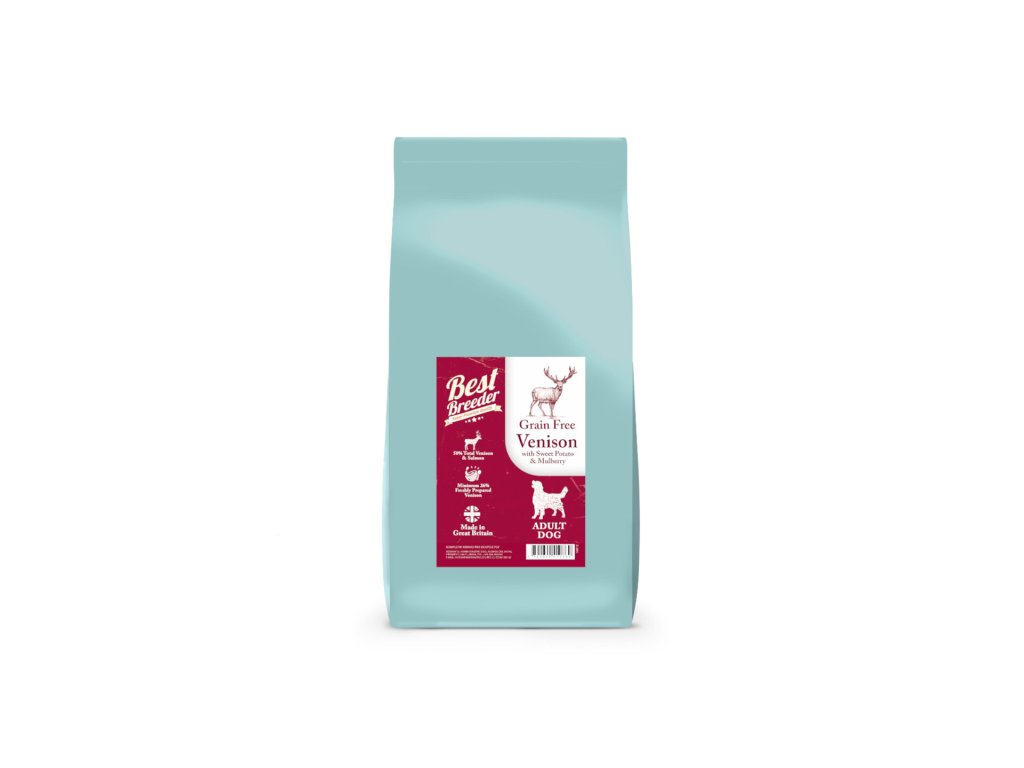 Zvěřina a losos 50 % (včetně čerstvě připravované zvěřiny 26 %, sušeného lososa 19 %, lososového oleje 2,5 %, lososového vývaru 2,5 %), sladké brambory 27 %, brambory, sladký hrášek 6 %, lněné semínko, řepná dužina, Omega 3 mastné kyseliny, minerály, vitaminy, zeleninový vývar, moruše 0,2 %, FOS 96 mg/kg, MOS 24 mg/kg