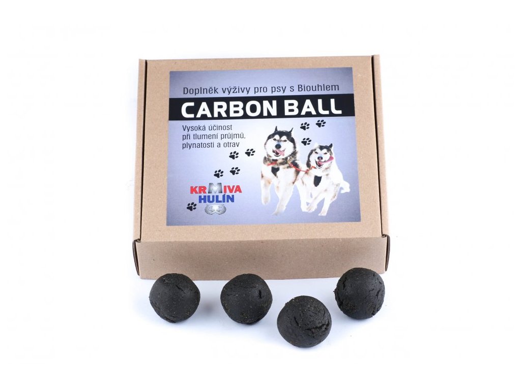 - Charakteristika: Náš výrobek Carbon Ball je účelovým doplňkem výživy pro psy s obsahem aktivního černého uhlí, které má vysokou účinnost při tlumení chronických i akutních průjmů, plynatosti, kvasných procesů ve střevech i u lehkých otrav. Účinná látka v Carbon kouli je Biochar, což je název pro mleté, dřevěné, aktivní černé uhlí, nebo-li také Biouhel, dříve lidově nazývané živočišné uhlí, protože se vyrábělo z kostí zvířat. Zrnitost - frakce použitého uhlí do směsi je velmi jemná a to 0,1-1 mm. Jedna koule o průměru 35 mm a hmotnosti 27 - 29 g obsahuje min. 2 g aktivního uhlí. To je dostačující dávka, která umožní ihned potlačit a posléze zastavit vodnatou stolici nebo velmi rychle eliminovat toxiny v žaludku a střevech.