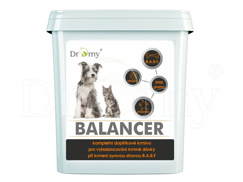 Dromy BALANCER - BARF je speciální doplňkové krmivo ve formě prášku (nebo u malých plemen v tabletách - Dromy Balancer 200g) s obsahem organicky vázaného vápníku, mikroprvků a vitaminů, určené k vybalancování krmné dávky psů a koček krmených syrovou stravou BARF.