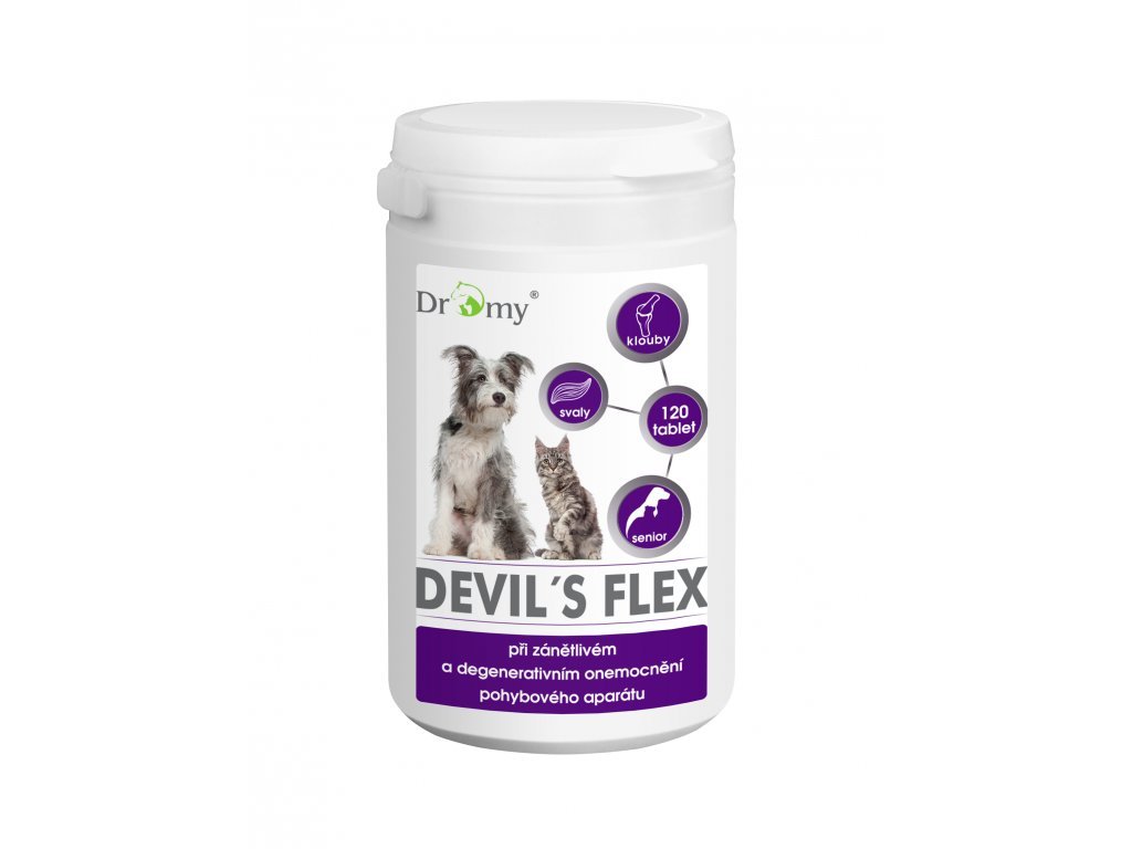Každé onemocnění kloubů a měkkých tkání je často doprovázeno vznikem zánětu a bolesti. Zánět a bolest dále vedou k omezení hybnosti, dochází k otokům měkkých struktur, zmnožení kloubní tekutiny, která způsobuje otok kloubu. Díky zánětu je okolí kloubu více prokrvené, teplejší a bolestivé. Pokud se v tomto stadiu nepodaří zánětlivý proces zastavit, může dojít až k poškození chrupavky. Souběžně může docházet ke ztuhnutí a úbytku svalové tkáně zejména v okolí nosných kloubů. Devil´s flex nabízí kombinaci aktivních látek, které účinně působí na zmírnění symptomů zánětlivých a degenerativních procesů pohybového aparátu. Rostlinný extrakt Devil´s claw - Harpagophytum procumbens vykazuje protizánětlivé, protirevmatické, analgetické účinky, je vhodný téže při myalgii a fibróze. Tyto vlastnosti rostlinné drogy byly uznány Britskou farmakologickou společností (British Pharmacopoeia).
