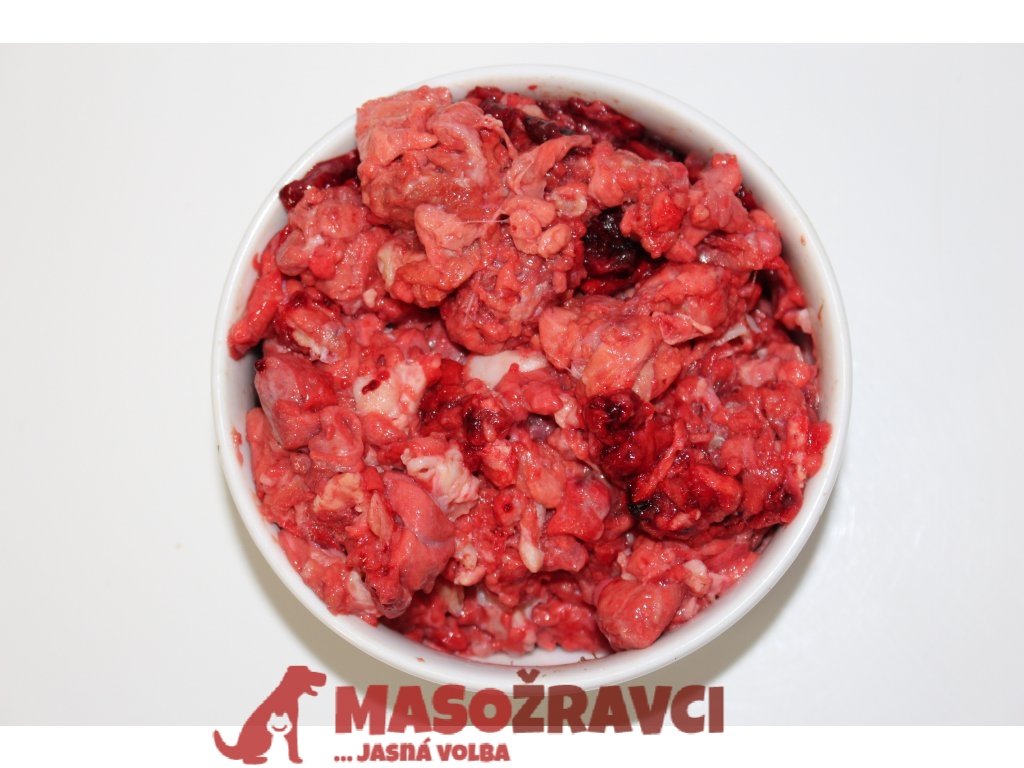 30 % hovězí ořez, 30 % hovězí plíce, 30 % krůtí skelet,10 % hovězí dršťky.