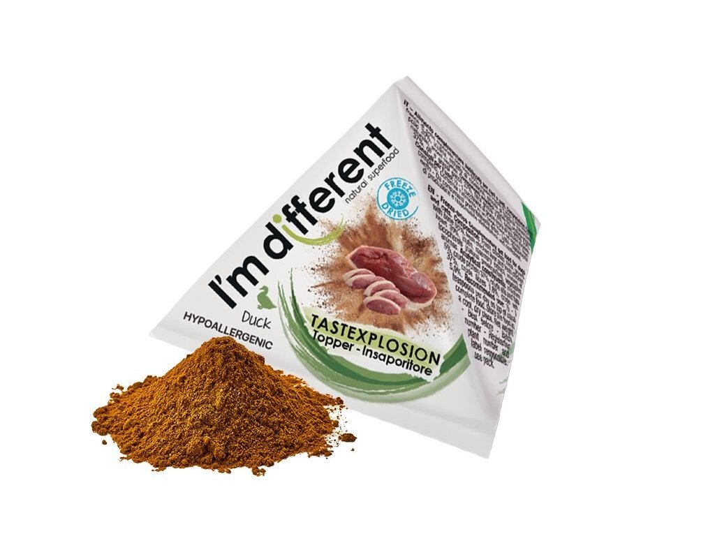 Mrazem sušený masový prášek vyrobený lyfiolizací . Díky vynikající chutnosti (obsah 95 % masa pouze kachny) ideální pro přimíchání do krmení - pro rozkrmení u psů a koček trpících nechutenstvím, při rekonvalescenci nebo i pro ty nejmlsnější kočičí jazýčky. Potravinářská kvalita i provoz, obohaceno o inulin pro podporu střevní mikroflory.