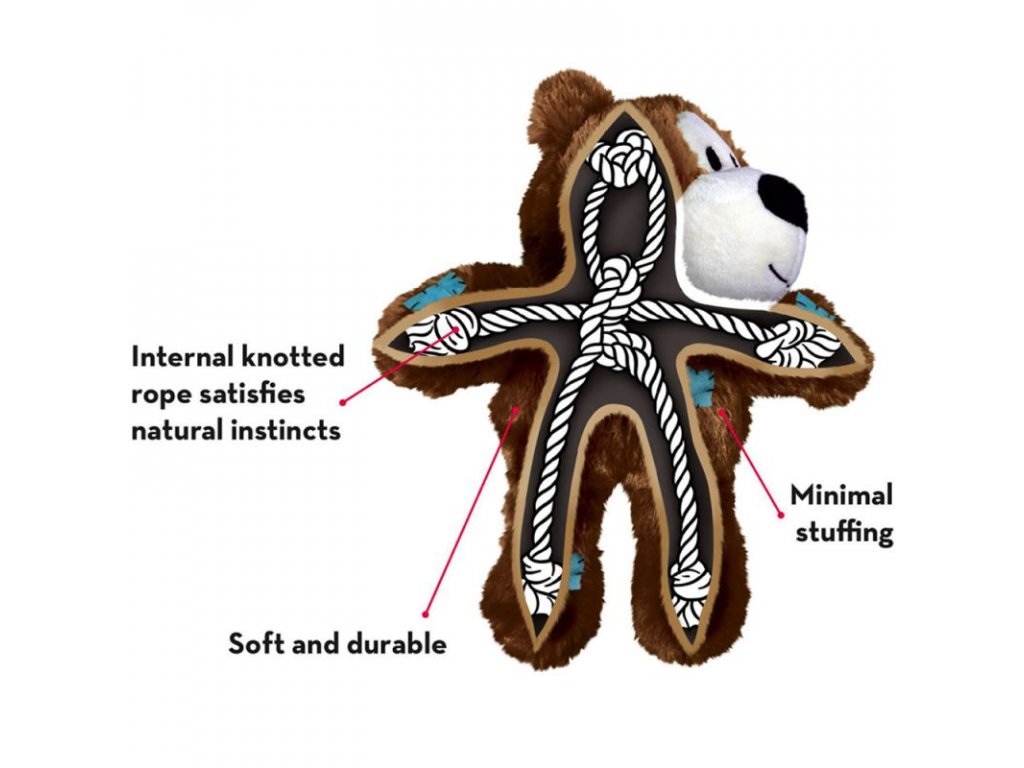 Roztomilý heboučký medvídek s minimem výplně a bytelnou uzlovou kostrou. Navíc vše v odolnějším a kvalitním zpracování značky KONG.