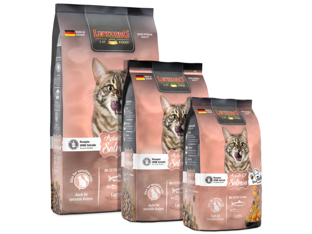 Složení: čerstvý losos (30%), rybí moučka z mořských ryb (20%), amarant (15%), hrachová mouka, bramborový škrob, drůbeží protein, drůbeží tuk, mořský zooplankton (krill 5%), hydrolyzovaná drůbeží játra, pivovarské kvasnice (2,5%), sušená jádra hroznového vína (1,5%), chia semena (1,3%), sušené lusky svatojánského chleba, chlorid draselný, inulin z čekanky.