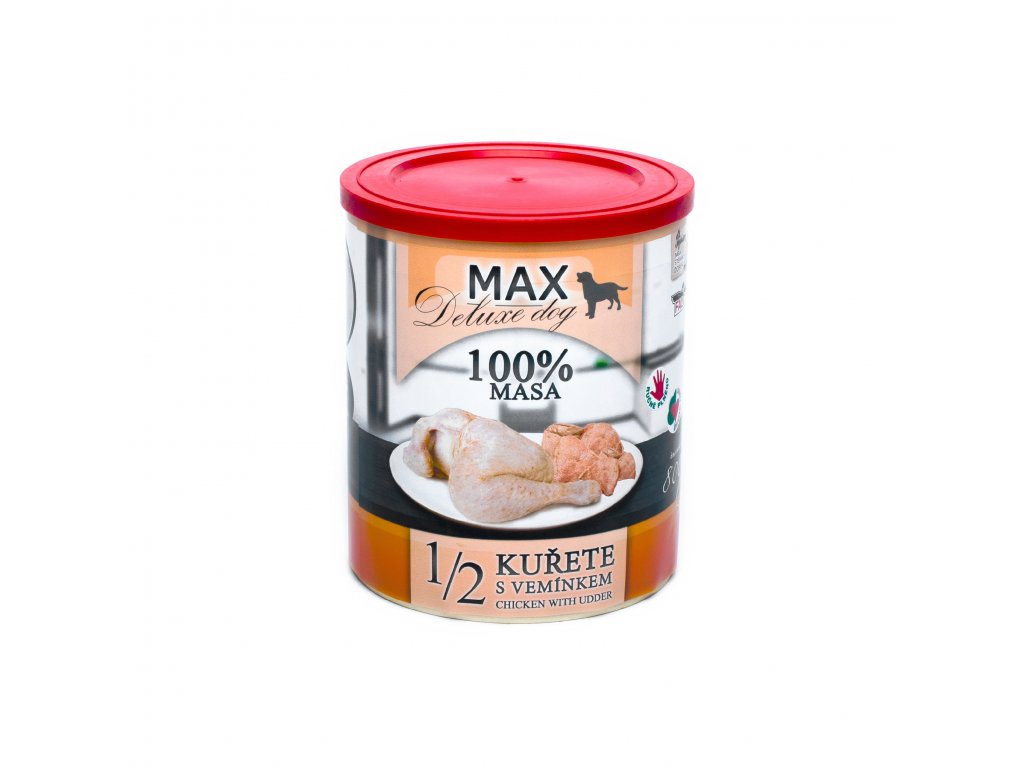 Čistě masová konzerva de luxe s celou polovinou kuřete s výživným hovězím vemínkem, pro lepší obrannyschopnost.
