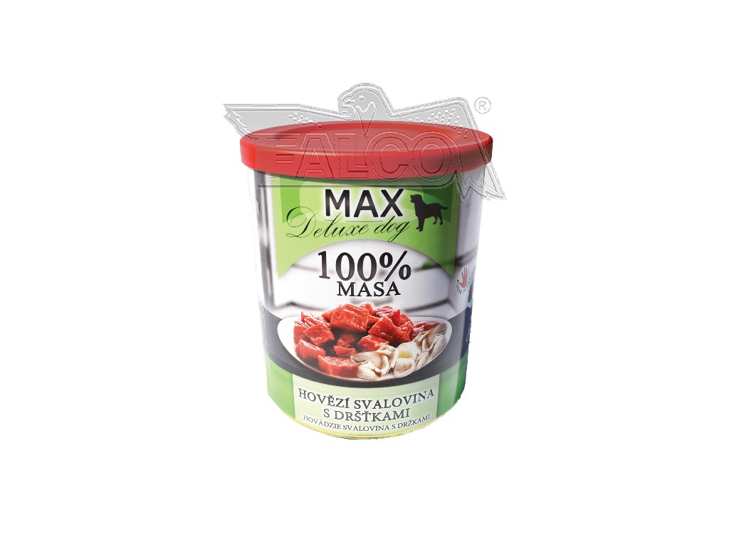 Čistě masová konzerva de luxe - lahodné kostičky hovězí a vepřové svaloviny obohacené o 25 % drštek pro zdravé zažívání Vašeho psa.