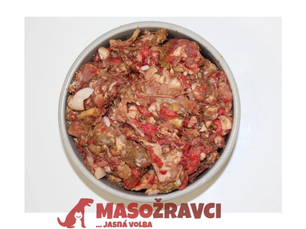 50% vepřová svalovina, 20% hovězí chrupavka, 20% hovězí plíce a 10% neprané dršťky