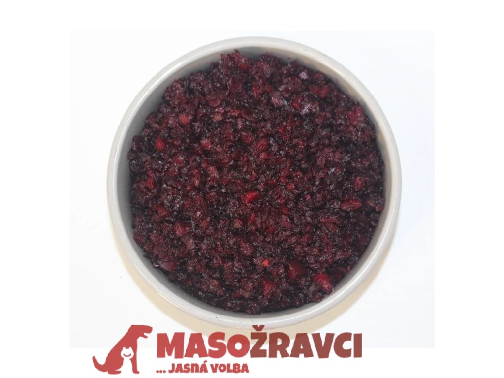Nasekaná červená řepa a zelí. Směs obsahující minimum karotenu, vhodná tedy i pro psy se sklonem k reznutí srsti.