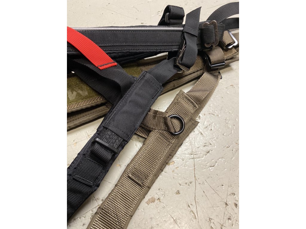 • Nejprve je potřeba nastavit správnou délku zad. Pomocí dvou popruhů na koni postroje posuneme smyčku, za kterou nás pes tahá (tažný bod), až ke kořeni ocasu. Oba dva popruhy musí být stejně dlouhé! Popruhy po nastavení protáhneme dvakrát ocelovou přezkou, aby se zabránilo jejich vyklouznutí.