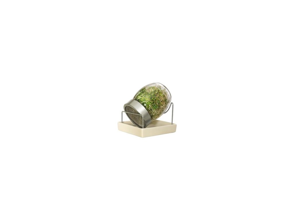 První den: vložte semena do sklenice, našroubujte víčko, zalejte dostatečným množstvím vody minimálně do ¾ nádoby a nechte namáčet po dobu uvedenou na obalu semen. Po skončení namáčení semena důkladně propláchněte vodou, obraťte sklenici dnem vzhůru a několikrát protřepejte, aby vytekla všechna voda. Umístěte sklenici na kovový stojánek šikmo víčkem dolů. Díky tomu bude moci přebytečná voda odkapat na keramickou misku podstavce. Sklenice by měla být umístěna na rovném povrchu na místě s pokojovou teplotou přibližně 20°C mimo dosah přímého světla a zdroje tepla.
