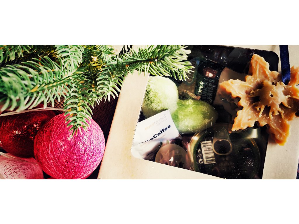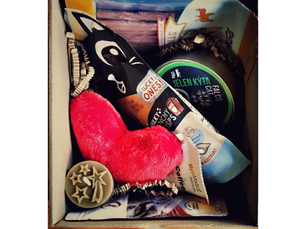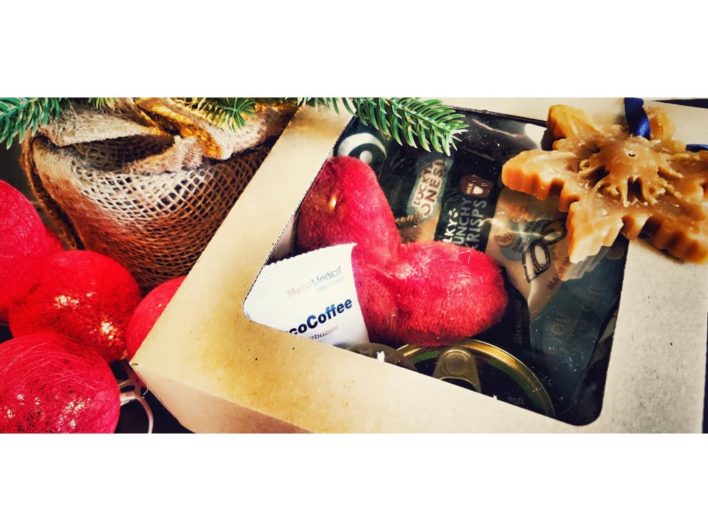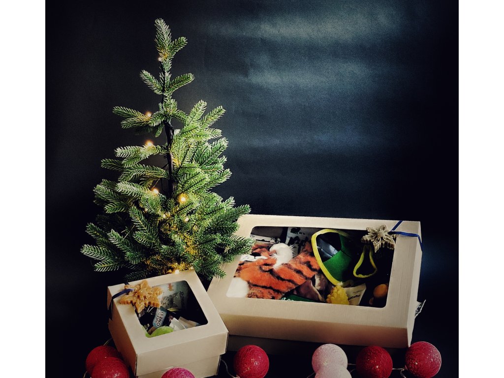 Krásná krabička plná dárečků podstromeček nejen pro kočičku ale i pár drobností pro Vás - pro potěšení a společnou vánoční atmosféru. Balíček obsahuje kvalitní konzervičku, dvoje pamlsky, drink, svíčku a ozdobičku z včelího vosku z České Sibiře od Spokojené včely, jedno kafíčko s houbami od Mycomedicy a skvělou hračku od Pískacích potvůrek ve tvaru srdíčka s šantou nebo kozlíkem, dle Vaší volby.