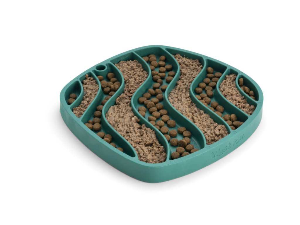 Oboustranná miska Feast Mat od americké značky West Paw nabízí dvě možnosti využití v jednom produktu: jako protihltací miska a zároveň jako lízací podložka. Z jedné strany má hlubší drážky, z nichž je pro psa těžší jídlo vydolovat, takže vše nezhltne tak rychle. Druhá strana má pak mělké drážky, které se hodí k olizování — to má na psa pozitivní účinky, protože se tím uklidní, odreaguje a také mu pomůže odbourat úzkost v situacích, které pes špatně snáší. Celý proces krmení je pro psa i zábavnější a pestřejší, musí totiž nad jídlem trochu přemýšlet, aby dobroty dostal ven. Podložka je navíc vyrobena z protiskluzového materiálu, takže psovi nebude utíkat po místnosti.